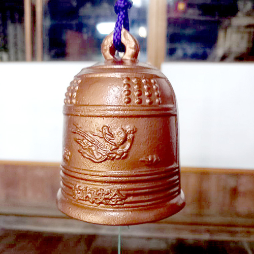 風鈴で梵鐘の形を再現するため、高さが約10cm、口径が約7.5cmと通常販売されている風鈴より大きめとなり、重量もあります。そのため、涼やかな音を出すのに苦労しましたが、ガラスの風鈴と違う音色を堪能ください。