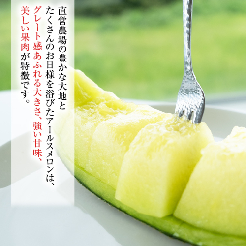 1本の苗から1玉しか収穫しない贅沢な栽培法で、直営農場の豊かな大地といっぱいのお日様を浴びたアールスメロンは、グレート感あふれる大きさ、強い甘味、美しい果肉が特徴です。