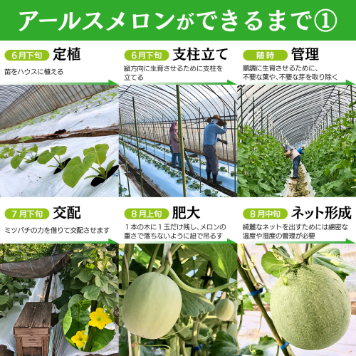 アールスメロンの苗植えは6月上旬から始まり、様々な管理作業(手間暇)をかけて、8月下旬から収穫が始まります。