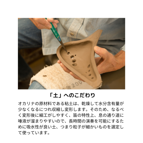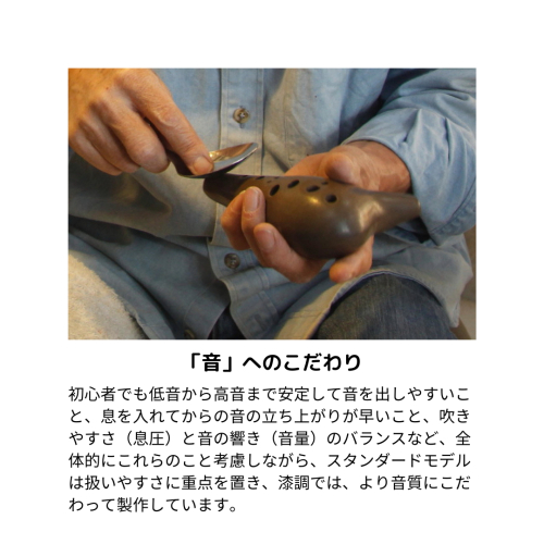 イタリア発祥のオカリナで、「和」のテイストを表現したい想いから、仕上げは日本古来の技法を用いて、漆塗りのような風合いとなっています。