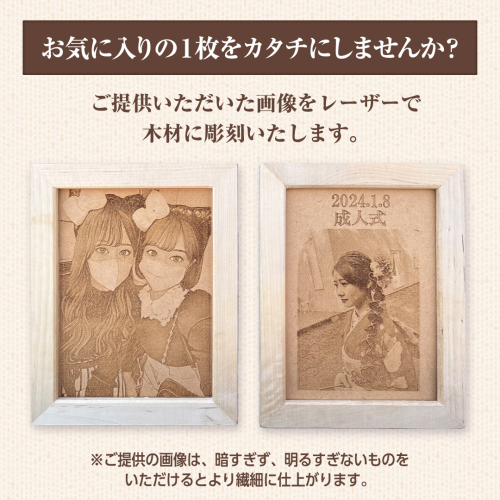気軽にスマホで思い出を画像で保存できますが、特にお気に入りの1枚をアナログでカタチにしませんか? 提供頂いた画像をレーザーで木材に彫刻いたします。 ※提供頂く画像は「暗すぎないもの」「明るすぎないもの」が、より繊細に仕上がります。 ※ご寄附後にお伝えするメールアドレスに、画像データをお送りいただきます。 【工夫やこだわり】 画像にレーザー彫刻に適した処理を行い、選び抜いた素材を採用することで、繊細なレーザー彫刻が可能となりました。 各種展示会やイベントで高評価をいただいている商品です。 【関わっている人】 田舎の加工屋社長を中心に、小学校からの同級生2名と、計3名のおっちゃん・おばちゃんが作ってます。 それが「チーム齋藤」です。 【お礼の品に対する想い】 2023年夏にレーザー加工機を導入し、試行錯誤しながら、大規模展示会や各イベントで高評価を得られるクオリティに作り上げました。 【ふるさと納税でやりたい事や生まれた変化】 ふるさと納税を通じ田舎の加工屋の作る商品を世の中に広めたい! 田舎の加工屋でも、超一級品のクオリティがあることを、全国の皆様に見ていただきたい! 【保存方法】 高温・多湿・直射日光を避け、涼しい場所に保管してください。