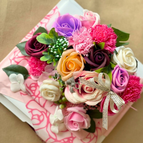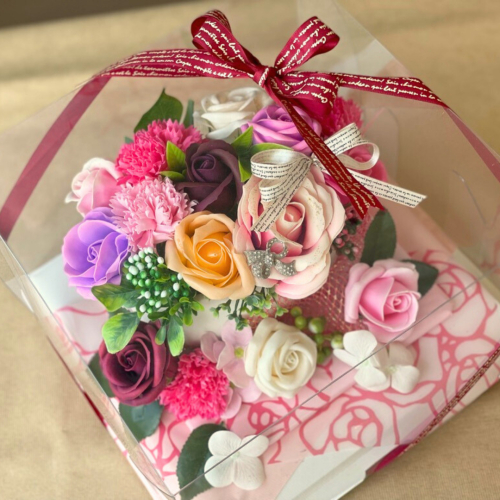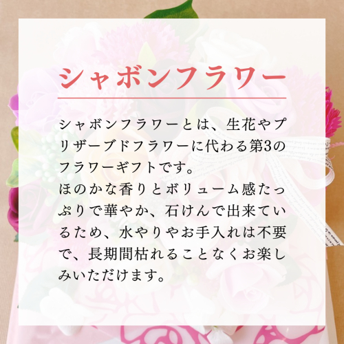 シャボンフラワーとは、生花やプリザーブドフラワーに代わる第3のフラワーギフトです。ほのかな香りとボリューム感たっぷりで華やか、石けんで出来ているため、水やり・お手入れは不要で、長期間枯れることなくお楽しみいただけます。