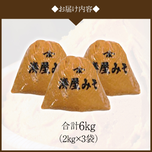 材料の大豆にこだわり、良質な地下水を使用した、まろやかで糀の甘味が引き立つ味噌です。糀をふんだんに使用し、100余年にわたり受け継がれた秘伝の醸造法で手間暇かけて仕込んでおります。 他の味噌の追随を許さない、味の豊かさをお楽しみください。 使いやすい2kg袋を3個セットでお届けいたします。 【賞味期限】 製造から半年 【アレルギー】 大豆 【注意事項】 ※お受け取り後は、すぐに状態をご確認ください。※ 万全を期して返礼品をお届けしていますが、万が一、不備等があった場合は返礼品受け取り時に、写真(画像)を添付のうえ電子メールにてご連絡ください。 日数が経ったものに関しましては対応いたしかねますので、ご了承ください。 また、不備等があった返礼品は食べたり、飲んだり、捨てたりせず、対応が決まるまで保管をお願いします。保管されてない場合、代替品での対応等が難しい場合がございます。 ご連絡先:sakuragawa@furusato-g.com ※クール便について 配送できない地域がございます※ ・伊豆諸島:青ヶ島村(青ヶ島)・利島村(利島)・御蔵島村(御蔵島)・式根島 ・小笠原諸島:小笠原村(父島・母島・硫黄島・南鳥島など) 【事業者名】 有限会社湊屋味噌醸造所