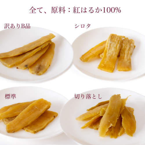干し芋は自然食品の為、同一品種でも収穫時期、天候等により、大きさ、形、硬さ等に違いが出てしまう事があります。白い粉は干し芋に含まれる麦芽糖が結晶化したものです。芋の皮やひげ根の付着、繊維や黒ずみが見られることがありますが、いずれも品質には問題御座いませんので、ご安心してお召し上がり下さい。