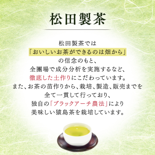 松田製茶では「おいしいお茶ができるのは畑から」の信念のもと、全團場で成分分析を実施するなど、徹底した土作りにこだわっています。また、お茶の苗作りから、栽培、製造、販売までを全て一貫して行っており、独自の「ブラックアーチ農法」により美味しい猿島茶を栽培しています。