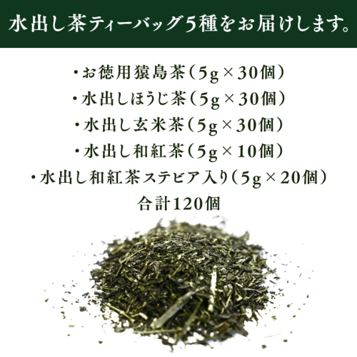 - お徳用猿島茶(5g×30個)、水出しほうじ茶(5g×30個)、水出し玄米茶(5g×30個)、水出し和紅茶(5g×10個)、水出し和紅茶ステビア入り(5g×20個)、合計120個