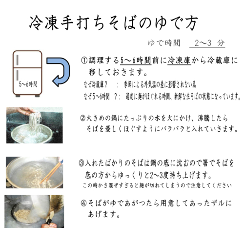 冷蔵庫に移し、約5時間で生そばに戻ります。写真入のゆで方の説明付なので、初めての方でも安心して調理が可能です。また、濃縮つゆが付いているので、冷たいそば・温かいそば 様々なアレンジメニューを作ることができます。本格的な手打ちそばをご家庭で手軽に味わうことができます。