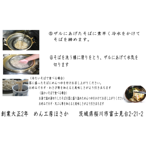 茨城県産「常陸秋そば」の八割そばを急速冷凍。簡易包装でお届け。写真入り茹で方の説明、濃縮つゆ付き。 お店でも人気の「韃靼そば茶100g」付き。 2015年日本ギフト大賞茨城県賞、筑波山地域ジオパーク認定商品に選定。 契約農家によって作られた、地元桜川産「常陸秋そば」を使用し、職人が手打ちした打ちたてのそばを急速冷凍しました。急速冷凍することにより冷蔵保存ではできない新鮮な状態での長期保存を可能にした商品です。 冷蔵庫に移し、約5時間で生そばに戻ります。写真入のゆで方の説明付なので、初めての方でも安心して調理が可能です。また、濃縮つゆが付いているので、冷たいそば・温かいそば 様々なアレンジメニューを作ることができます。本格的な手打ちそばをご家庭で手軽に味わうことができます。 【保存方法】 冷凍(18℃以下) 【賞味期限】 製造日から60日 【アレルギー】 小麦、そば、さば、ゼラチン、大豆 【注意事項】 ※クール便について 配送できない地域がございます※ ・伊豆諸島:青ヶ島村(青ヶ島)・利島村(利島)・御蔵島村(御蔵島)・式根島 ・小笠原諸島:小笠原村(父島・母島・硫黄島・南鳥島など) 【事業者】 めん工房ほさか