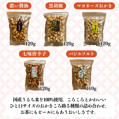 ころころとかわいいひと口サイズのおかきころ助5種類の詰め合わせ。お茶にもビールにもあうおいしさです。