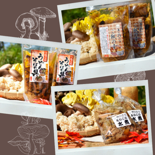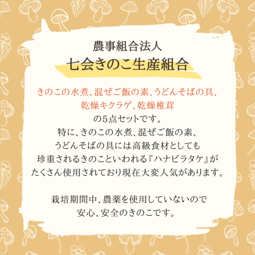 農事組合法人 七会きのこ生産組合で栽培、生産された美味しいきのこを使用した加工品の詰め合わせです。
