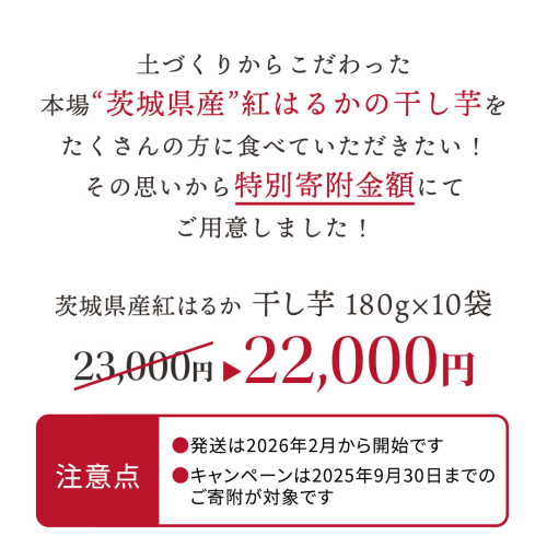 土づくりからこだわった本場“茨城県産”紅はるかの干し芋をたくさんの方に食べていただきたい!その思いから特別寄附金額にてご用意しました!