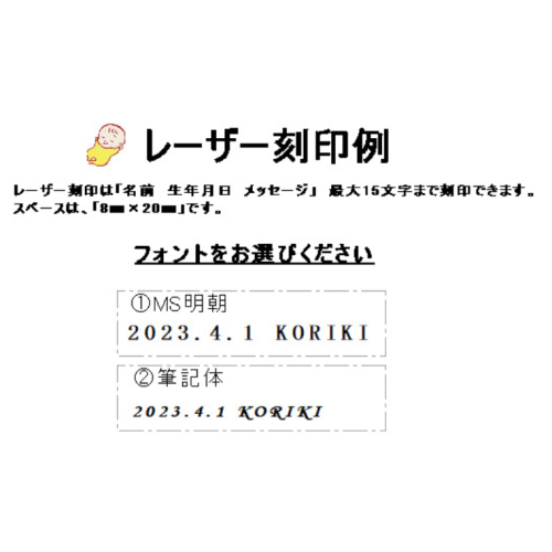 赤ちゃんの名前や、日付けを15文字ほど刻印できます。