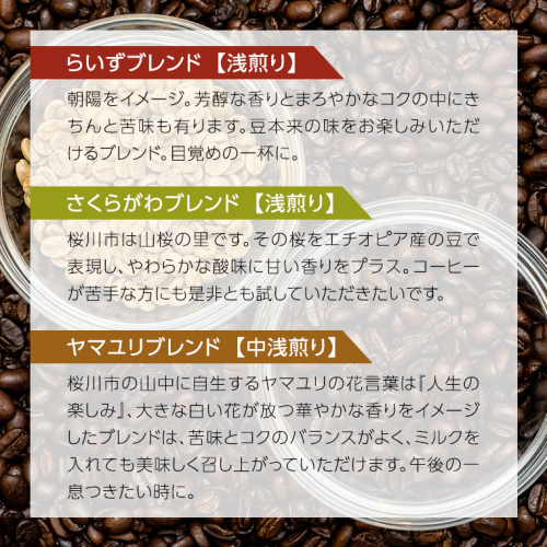豆のままでお届けいたします。 ■らいずブレンド[浅煎り] 朝陽をイメージ。芳醇な香りとまろやかなコクの中にきちんと苦味も有ります。豆本来の味をお楽しみいただけるブレンド。目覚めの一杯に。 ■さくらがわブレンド[浅煎り] 桜川市は山桜の里です。その桜をエチオピア産の豆で表現し、やわらかな酸味に甘い香りをプラス。コーヒーが苦手な方にも是非とも試していただきたいです。 ■ヤマユリブレンド[中浅煎り] 桜川市の山中に自生するヤマユリの花言葉は『人生の楽しみ』、大きな白い花が放つ華やかな香りをイメージしたブレンドは、苦味とコクのバランスがよく、ミルクを入れても美味しく召し上がっていただけます。午後の一息つきたい時に。 【賞味期限】 製造日より6ヶ月 【事業者名】 株式会社ライズK