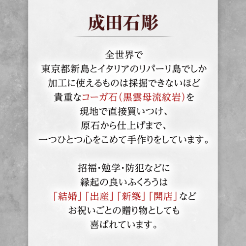 全世界で東京都新島とイタリアのリパーリ島でしか加工に使えるものは採掘できないほど貴重なコーガ石(黒雲母流紋岩)を現地で直接買いつけ、原石から仕上げまで、一つひとつ心をこめて手作りをしています。 招福・勉学・防犯などに縁起の良いふくろうは「結婚」「出産」「新築」「開店」などお祝いごとの贈り物としても喜ばれています。 《工夫やこだわり》 成田の真骨頂「のみ切り仕上げ」をしています。 石の表面を一打ち一打ち鑿(のみ)で仕上げる、大胆かつ繊細で高度な技術が必要とされる技法で、石の一刀仕上げとも言えるこの技法は、硬く冷たいイメージの石に軟らかさと温かさを醸し出してくれます。 《関わっている人》 2001年にテレビチャンピオン第1回全国石職人選手権に出場し、準優勝をいただくことができました。 とても懐かしく素敵な思い出です。 厚労大臣認定 一級技能士 県知事認定 ものづくりマイスター 県知事指定 優良県作品 【注意事項】 一つひとつ手作りのため、表情、大きさ、色合いなど多少の違いがございますが、手作りの温かさを感じていただけたら嬉しいです。 【事業者名】 成田石彫