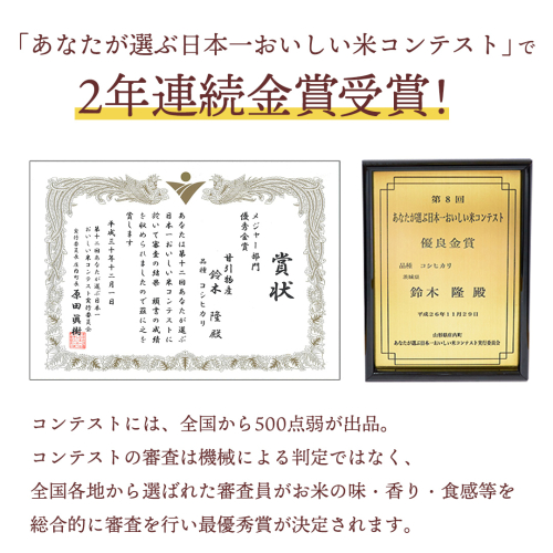 日本一おいしい米コンテストで2年連続金賞!山形県庄内町で開催されている「あなたが選ぶ日本一おいしい米コンテスト」で金賞を受賞、2年連続の入賞となりました。