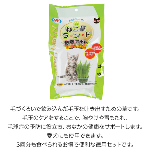 毛づくろいで飲み込んだ毛玉を吐き出すための草です。毛玉のケアをすることで、胸やけや胃もたれ、毛球症の予防に役立ち、おなかの健康をサポートします。2カップ付いて、同時栽培が可能!3回分も食べられるお得で便利な徳用セット!愛犬にも使用できます。