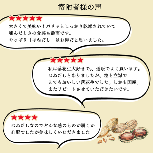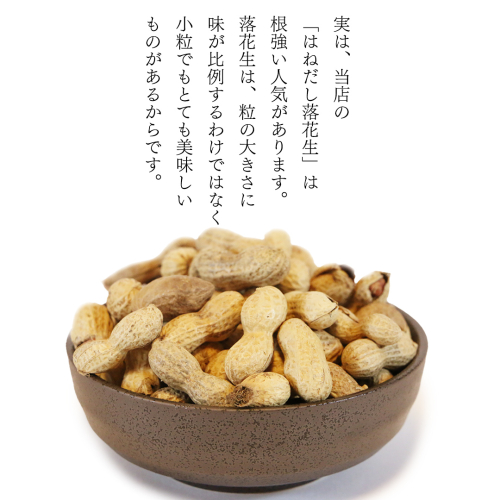 実は、当店のはねだし落花生は売れ筋商品で、根強い人気があります。 変な話ですが、良品より美味しい時もあるくらいです。 これは、落花生は粒が大きければ美味しいわけではなく、小粒でもとても美味しい落花生があるからです。 小粒だけの商品もあります。(中実というランクになります。) そんなわけで、大きい粒の中で、小さいことではじかれたものや、殻が黒いとか変形とかの理由ではじかれたものを集めたような商品なのです。 普通品より量目も多く、大変お得な商品です。 有機肥料を使用して、土作りを行っています。農薬の使用も極力少なく、安全に食べて頂けるように栽培を行っています。 私と妻が中心になり、パートのスタッフの皆さんと、ベトナム研修生のみんなで落花生栽培、袋詰めを行っています。みんなで美味しい落花生を食べてもらいたくて頑張っています。 桜川市の落花生栽培の歴史は古く、ほとんどの農家が落花生栽培を行った時代があります。ただ、他作物への転換、農家高齢化などにより、年々栽培は減少しています。つくば近郊でできる美味しい落花生を、多くの皆様に知ってもらい、残していきたいとの思いで栽培を行っています。 当店の落花生が、桜川市のふるさと納税品に選定して頂き、より美味しいものを発送するべく頑張ろうという気持ちになりました。 【保存方法】 高温・多湿・直射日光を避け、涼しい場所に保管してください。 【賞味期限】 120日 別途商品ラベルに記載 【アレルギー】 落花生(ピーナッツ) 【注意事項】 直射日光を避け、開封後はなるべく早くご賞味下さい。 【事業者名】 今井落花生店
