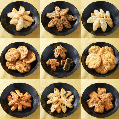 【9袋詰め合せ内訳】・黒ごま餅(外務大臣賞)・かき餅(名誉会長賞)・サックリしみ角餅(農林水産大臣賞)・おこげ味(全菓博会長賞)・えび餅・かきもち・かきもちミックス・サラダ丸餅(優秀賞)・しみ満月焼
