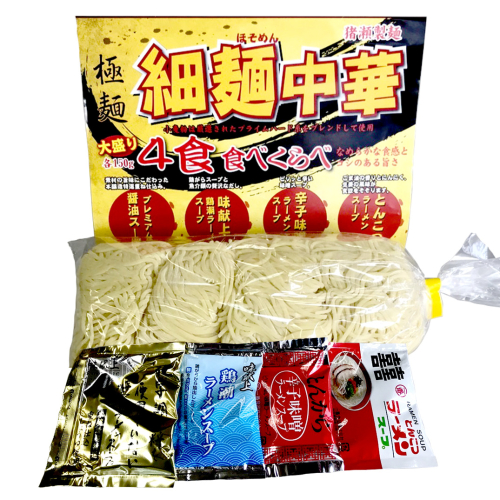 (細麺セット) 麺:150g×4食 ラーメンスープ:4種各1個(プレミアム醤油・味献上鶏潮・辛子味噌・とんこつ)