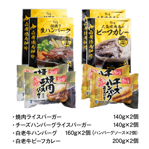 徳寿オリジナル詰め合わせ(焼肉ライスバーガー、チーズハンバーグライスバーガー、白老牛ハンバーグ、白老牛ビーフカレー)