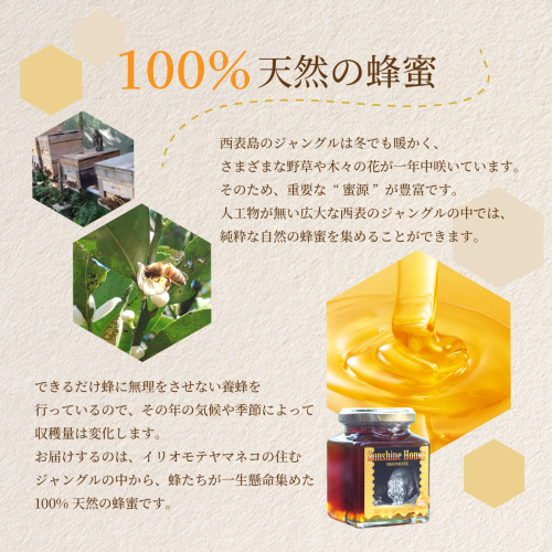 西表島の森で採れる、非加熱の天然はちみつです。 イリオモテヤマネコも棲むジャングルの木々の花の蜜は、芳醇な味わいと香りが特徴。 西表養蜂園のオーナーが営むニライナリゾートの朝食でお召し上がりいただくと大変好評です。 希少な自然環境が育む贅沢な逸品をお楽しみください。 ※画像はイメージです ※1歳未満の乳児には与えないでください。