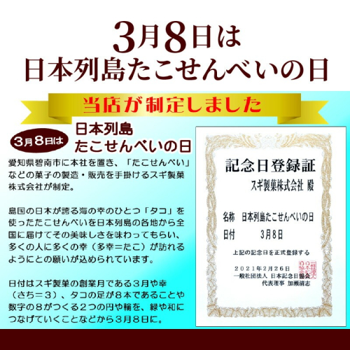 程よい厚みで食べ応え十分なたこせんべいの製造過程で発生する形・大きさ不揃い又は割れたたこせんべいを保存に便利なチャック付き袋に詰め、海鮮せんべいの名産地である愛知三河の工場から直送します。