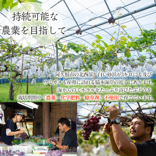 安心・安全でおいしいぶどうを作りたいと、阿久根の美しいビーチのすぐそばで、海からのミネラルをたっぷり浴び、農薬・化学肥料・除草剤を一切使用せず栽培しています。 農薬や化学肥料のかわりに木酢液・炭パウダー・自家製青草発酵液等を散布し、愛情込めて育てあげました。 冷凍するとシャーベットのようになり、皮も食べやすくなります。 栄養たっぷりなぶどうを皮ごと是非お召し上がりください。 地産理由:阿久根市内で生産されているため
