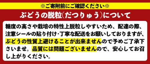 糖度の高さや栽培の特性上脱粒しやすいため、配達の際、注意シールの貼り付け・丁寧な配送をお願いしておりますが、ぶどうの性質上避けることが出来ませんのであらかじめご了承くださいませ。