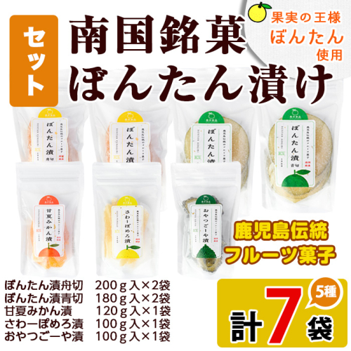 - 鹿児島伝統のフルーツ菓子!ぼんたん漬セット(合計7袋) 鹿児島県 阿久根市 特産品 ボンタン ぼんたん漬舟切 ぼんたん漬青切 甘夏みかん漬 さわーぽめろ漬 おやつごーや漬 お菓子 おやつ 果物 詰合せ 詰め合わせ ギフト 贈答【泰平食品】akn007-04