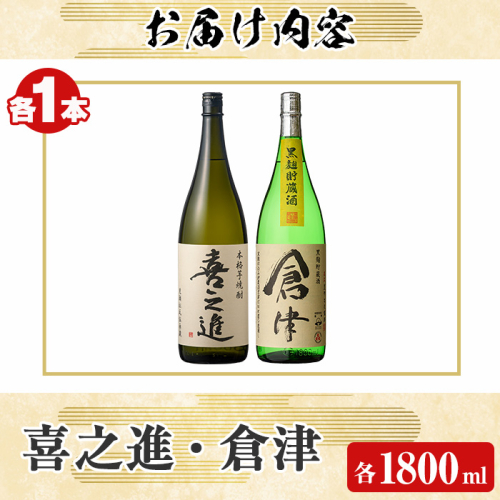 薩摩焼酎「喜之進」と「倉津」セット (各1800ml×合計2本) 1升瓶 国産 焼酎 いも焼酎 お酒 アルコール 水割り お湯割り ロック【齊藤商店】akn020-10 137130 - 鹿児島県阿久根市