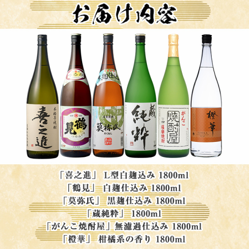 喜之進と地元蔵元(大石酒造)との阿久根焼酎満足セット「喜之進・鶴見・莫弥氏・蔵純粋・がんこ焼酎屋・橙華」(合計6本・各1800ml)1升瓶 国産 焼酎 いも焼酎 お酒 アルコール 水割り お湯割り ロック【齊藤商店】akn020-35