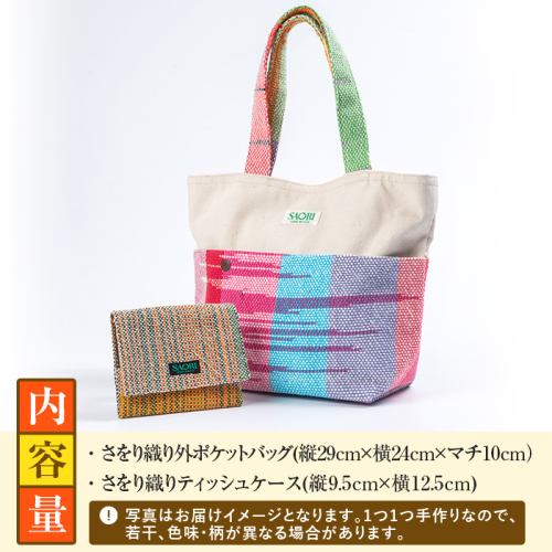 さをり織り外ポケットバッグ&ティッシュケース(計2つ)国産 トートバッグ 小物入れ 工芸品 手提げ【デイハウスふたば脇本】akn041-05 137150 - 鹿児島県阿久根市