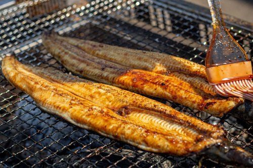 一瞬でさばくので炭火にのせると、うなぎが動き出します。
