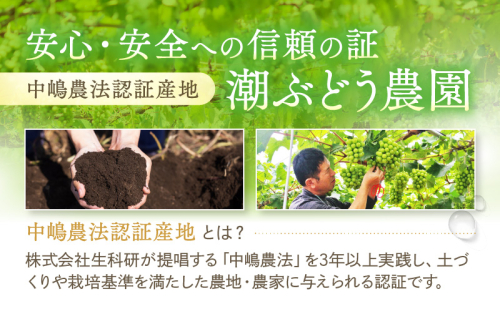 日本一のぶどう作りを目指す、中嶋農法認証産地である「潮ぶどう農園」。土壌診断に基づく健全な土づくり、作物の健全な生育を維持するための生育コントロール技術、2つの基本技術で作り上げたこだわりのシャインマスカットです。