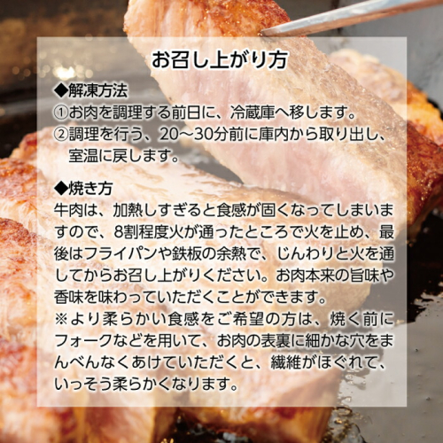 ※より柔らかい食感をご希望の方は、焼く前にフォークなどを用いて、お肉の表裏に細かな穴をまんべんなくあけていただくと、繊維がほぐれて、いっそう柔らかくなります。