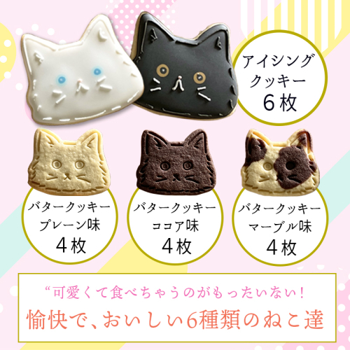 猫への愛情をたっぷり詰め込んだアイシングクッキーやバタークッキーの詰め合わせです。 中身は6種類の猫のアイシングクッキーのほか、ホロッ!サクッ!と香り高いバタークッキーがたっぷり楽しめる内容になっています。
