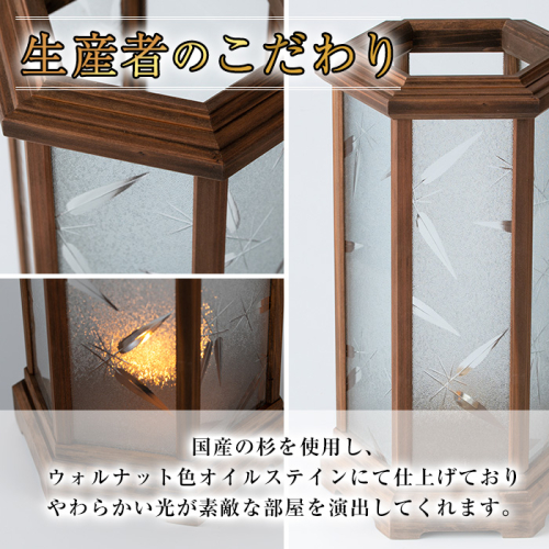 昭和45年創業、第27回技能五輪全国大会第一位の事績をもつ職人が一つひとつ手作りした和室向けのナイトスタンドです。 細部にわたり木の組み具合に職人の丁寧さを感じられます。 国産の杉を使用し、ウォルナット色オイルステインにて仕上げており、やわらかい光が素敵な部屋を演出してくれます。 地場産品理由:町外で入手した木材を使って、区域内事業者が製品図面を作成し、オリジナルの商品を製造するものでパーツ作成・組立・梱包・発送作業を事業者のみで一貫して行うことで返礼品の付加価値の半分を一定程度以上上回る割合が区域内で行われる工程によるため。