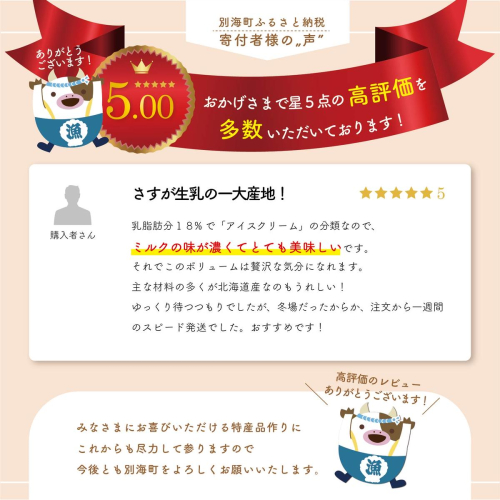 乳牛の数10万頭、年間生乳生産量50万トン、文字通り酪農日本一を誇る北海道別海町がお届けする、こだわり生乳を使った「アイスクリーム」です。別海町内の牧場で大切に育てられた乳牛のしぼりたて生乳を原材料とし、乳化剤・安定剤等の添加物は一切使用されておらず、これぞ本物のアイスクリームです。生乳生産量が日本一なだけでなく、味も抜群と評判です!