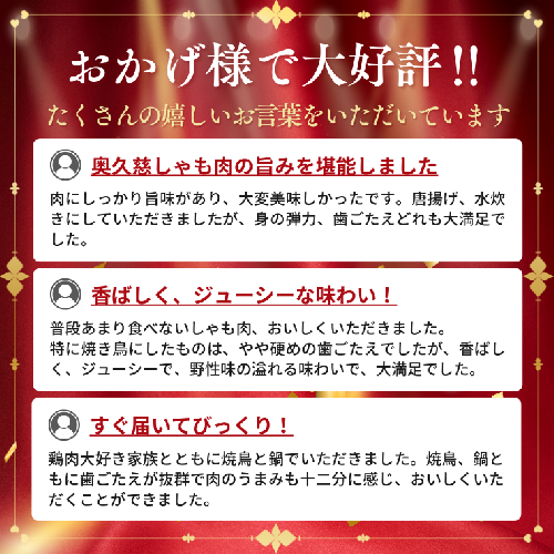 全国特殊鶏(地鶏)味の品評会で第1位に輝いた、地鶏の最高峰です。