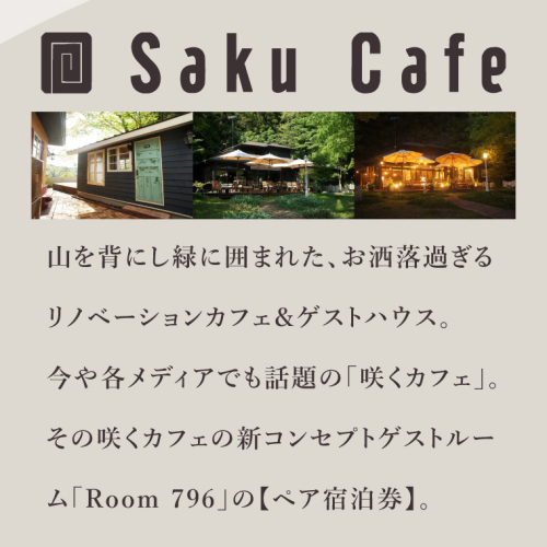 その咲くカフェの新コンセプトゲストルーム「Room 796」の【1泊2日ペア宿泊券 + 咲くカフェの特別ディナーコース & モーニングの2食付】。
