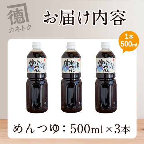 めんつゆ(500ml×3本)  調味料 麺つゆ つゆ そうめん 出汁巻き そば そうめん おひたし 蕎麦 出汁 ダシ【佐賀屋醸造店】akn003-01 1379231 - 鹿児島県阿久根市