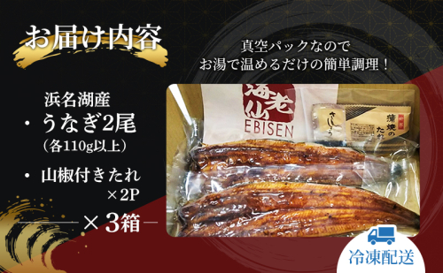 - 《うなぎ蒲焼約110g×2尾(静岡県浜名湖産)、山椒付フィルムタレ10ml×2P》×3箱
