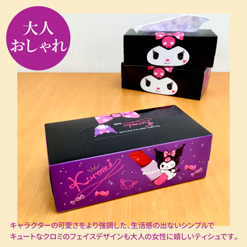 パープルの原紙にパープルのプリントが入った、大人おしゃれな使うたびにドキドキ、ワクワクするようなティシュです。キャラクターの可愛さをより強調した、生活感の出ないシンプルでキュートなクロミのフェイスデザインも大人の女性に嬉しいティシュです。