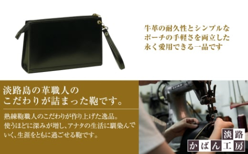 創業50年の伝統を受け継いだ淡路かばん工房の職人が丹念に製作。軽量で無駄のないシンプルな構造で、永く愛用できる一品です。牛革のスムース革の耐久性とシンプルなポーチの手軽さの両立を追求しています。