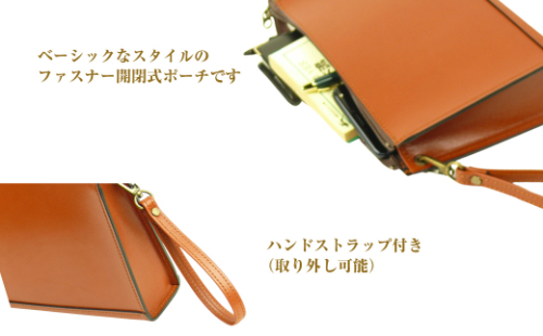 【シンプルで実用的な本革メンズポーチ】シンプルなデザインで、ベーシックなスタイルのファスナー開閉式ポーチ(ハンドストラップ付き)です。実用的で、かつ、飽きのこないシンプルなデザインのため、本革メンズポーチの定番として、いつの時代でも受け入れられるデザインです。