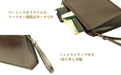 【素材】牛革(ステア・スムース革)【商品仕様】ファスナー開閉式/ハンドストラップ(取り外し可能)/内ポケット(後1)