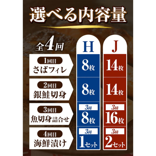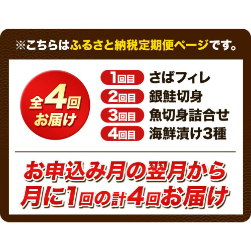 - 【定期便 全4回】サバフィレ 銀鮭切身 魚切り身詰合せ 海鮮漬け 選べる 内容量 株式会社魚鶴商店《お申し込み月の翌月より出荷開始》 和歌山県 日高町 鮭 さけ 紅さけ 切り身 さば 塩さば 焼き魚 焼くだけ 簡単 魚 さかな タラ サーモン カンパチしらす