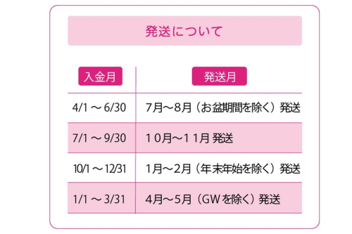 10月1日-12月31日ご入金確認分までは、1月-2月末までに発送いたします。(年末年始除く)