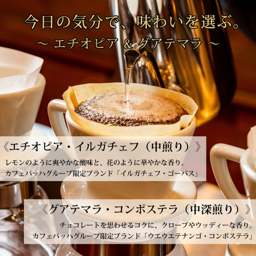カフェバッハグループ限定「エチオピア・イルガチェフ・ゴーバス」と「グアテマラ・ウエウエテナンゴ・コンポステラ」をセットにしました。