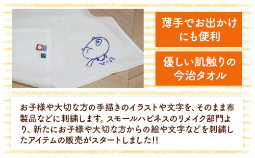 お子様や大切な方の手描きのイラストや文字を、そのまま布製品などに刺繍します。 スモールハピネスのリメイク部門より、新たにお子様や大切な方からの絵や文字などを刺繍したアイテムの販売がスタートしました? 思い出の品として飾ったり、日用品として使用することも可能です。 今だけの特別な思い出をカタチにするのにピッタリです! 【寄付お申し込み後の流れ】 ・寄付お申し込み後、スモールハピネスよりメールを送信いたします。 ・メールの内容をご確認いただき、記載の連絡先にメールにてご連絡ください。 ・生地、刺繍糸の色やイラスト等メールにて打ち合わせます。 ・イメージ画像で事前にご確認いただいてから刺繍いたします。 ・制作、完成いたしましたらお届けとなります。